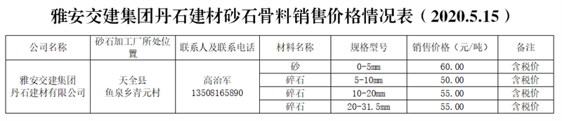 丹石建材有限公司。丹石公司是天全縣人民政府指定天全縣二郎山文化旅游投資開發(fā)有限公司與雅安市交通建設(shè)(集團(tuán))有限責(zé)任公司共同組建的合資公司。公司通過公開競(jìng)拍取得儲(chǔ)量2000萬(wàn)方的魚泉獅子山灰?guī)r礦,并在天全縣魚泉鄉(xiāng)青元村建立砂石骨料生產(chǎn)線,設(shè)計(jì)年產(chǎn)能200萬(wàn)噸。目前,礦山開采項(xiàng)目處于在建階段,砂石生產(chǎn)加工廠區(qū)處于設(shè)備調(diào)試和產(chǎn)能驗(yàn)收階段。生產(chǎn)廠區(qū)距雨城區(qū)中心城區(qū)約50公里。