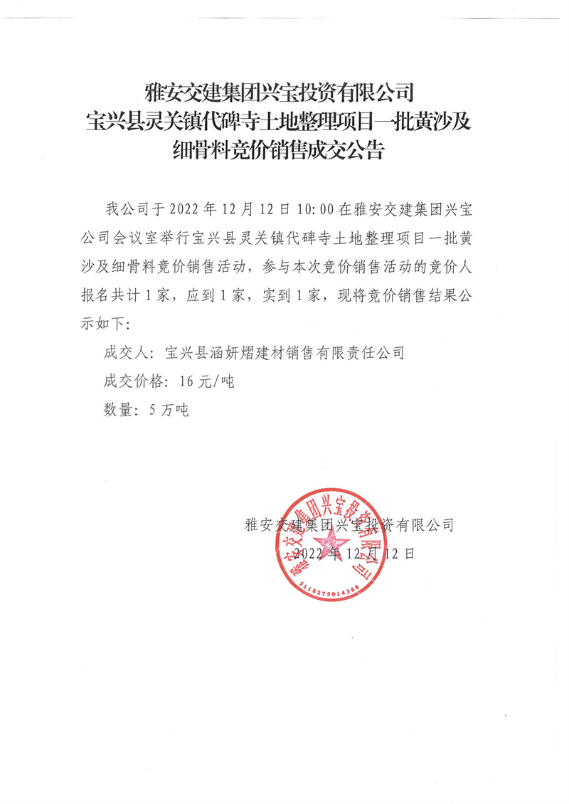 雅安交建集團(tuán)興寶投資有限公司寶興縣靈關(guān)鎮(zhèn)代碑寺土地整理項(xiàng)目5萬噸黃沙及細(xì)骨料競價(jià)銷售成交公告(2022-12-12)