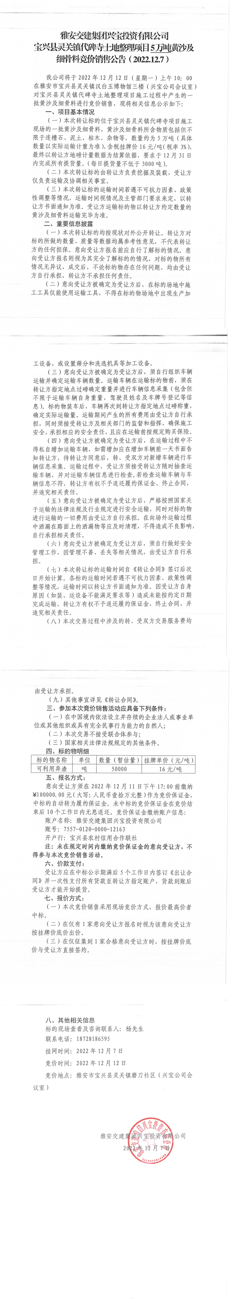 雅安交建集團興寶投資有限公司寶興縣靈關(guān)鎮(zhèn)代碑寺土地整理項目一批黃沙及細骨料競價銷售掛網(wǎng)公告2022.12.7