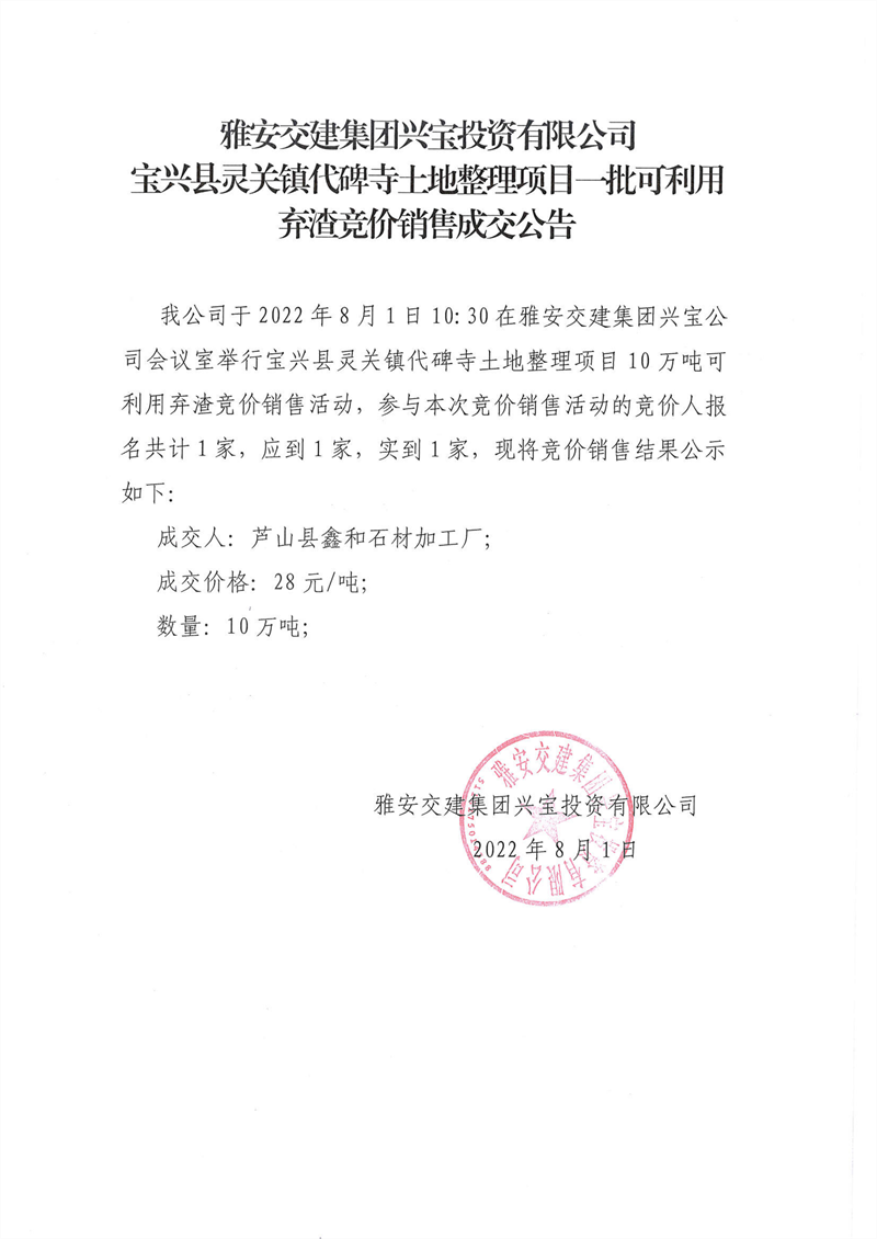 雅安交建集團(tuán)興寶投資有限公司靈關(guān)鎮(zhèn)代碑寺土地整理項(xiàng)目10萬噸可利用棄渣競(jìng)價(jià)銷售成交公告(2022.8.1)