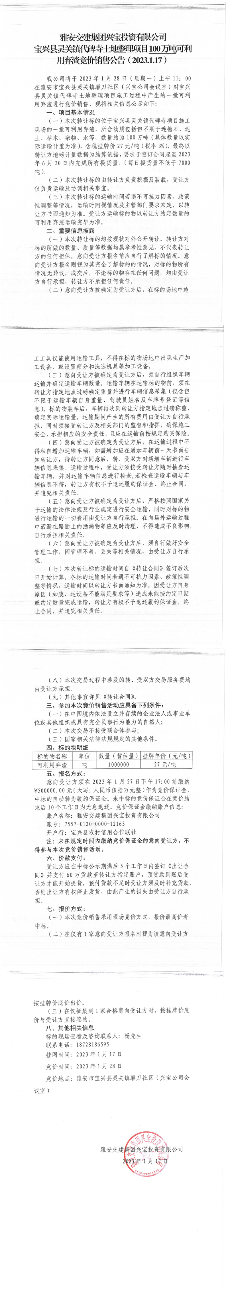 雅安交建集團興寶投資有限公司100萬噸可利用棄渣競價銷售流標公告(2023.1.16)