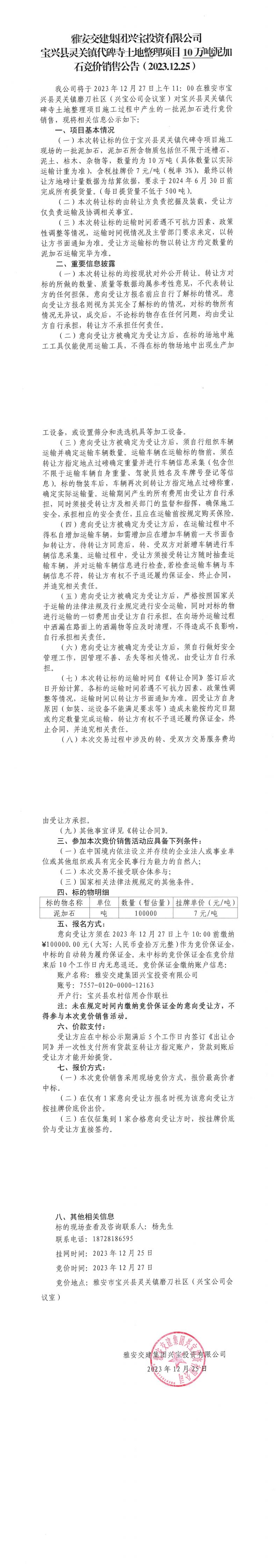 雅安交建集團興寶投資有限公司10萬噸泥加石競價銷售公告(2023.12.25)