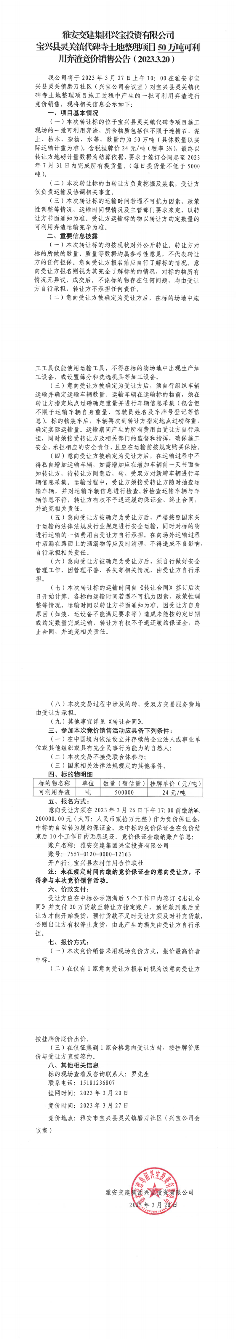 雅安交建集團(tuán)興寶投資有限公司代碑寺土地整理項目50萬噸可利用棄渣競價銷售公告(2023.3.20)