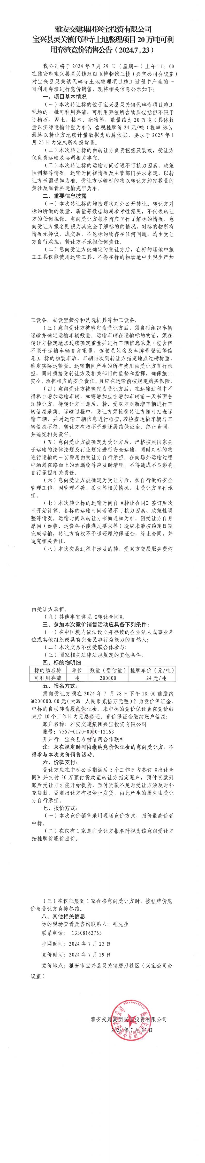 雅安交建集團(tuán)興寶投資有限公司靈關(guān)鎮(zhèn)代碑寺土地整理項(xiàng)目20萬噸可利用棄渣競價銷售公告(2024.7.23)