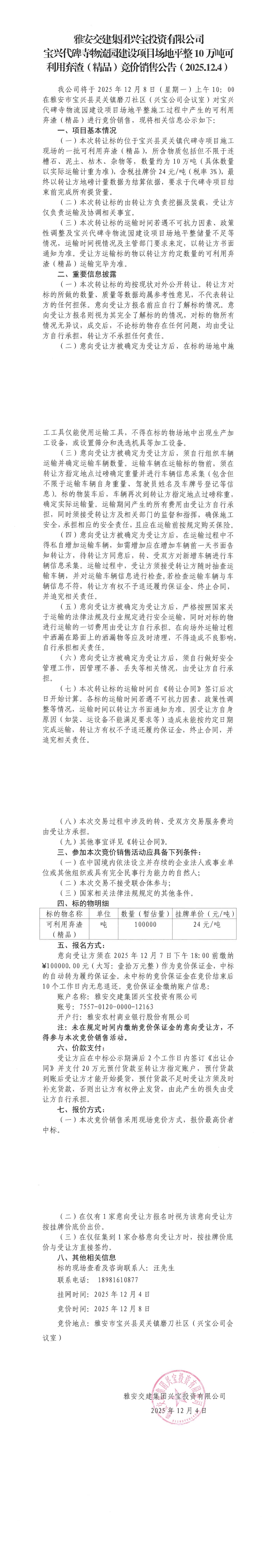 雅安交建集團(tuán)興寶投資有限公司10萬噸可利用棄渣(精品)競價(jià)銷售掛網(wǎng)公告(2025.12.04)